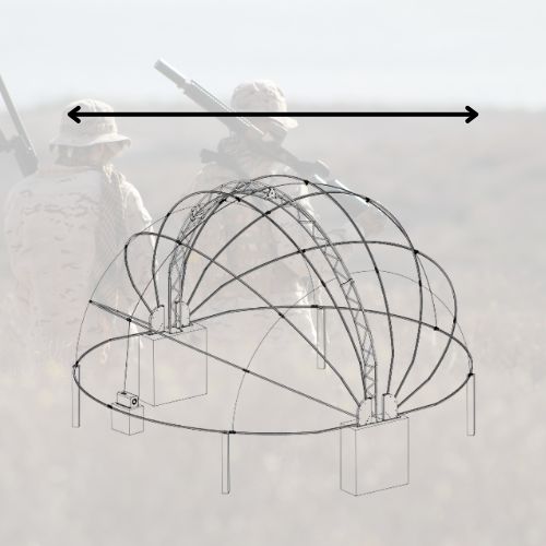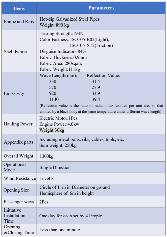 The tent size is 11M(diameter)*6M (height). Its tarpaulin is made of high-strength polyester cloth coated with anti-infrared and wave-absorbing materials. The exterior appearance is painted with digital camouflage of desert color. It could improve concealment and survivability of the equipment, and could work in an environment of -30~70 degrees Celsius.